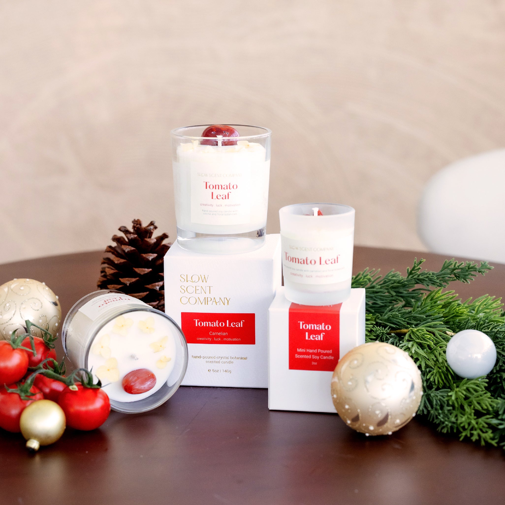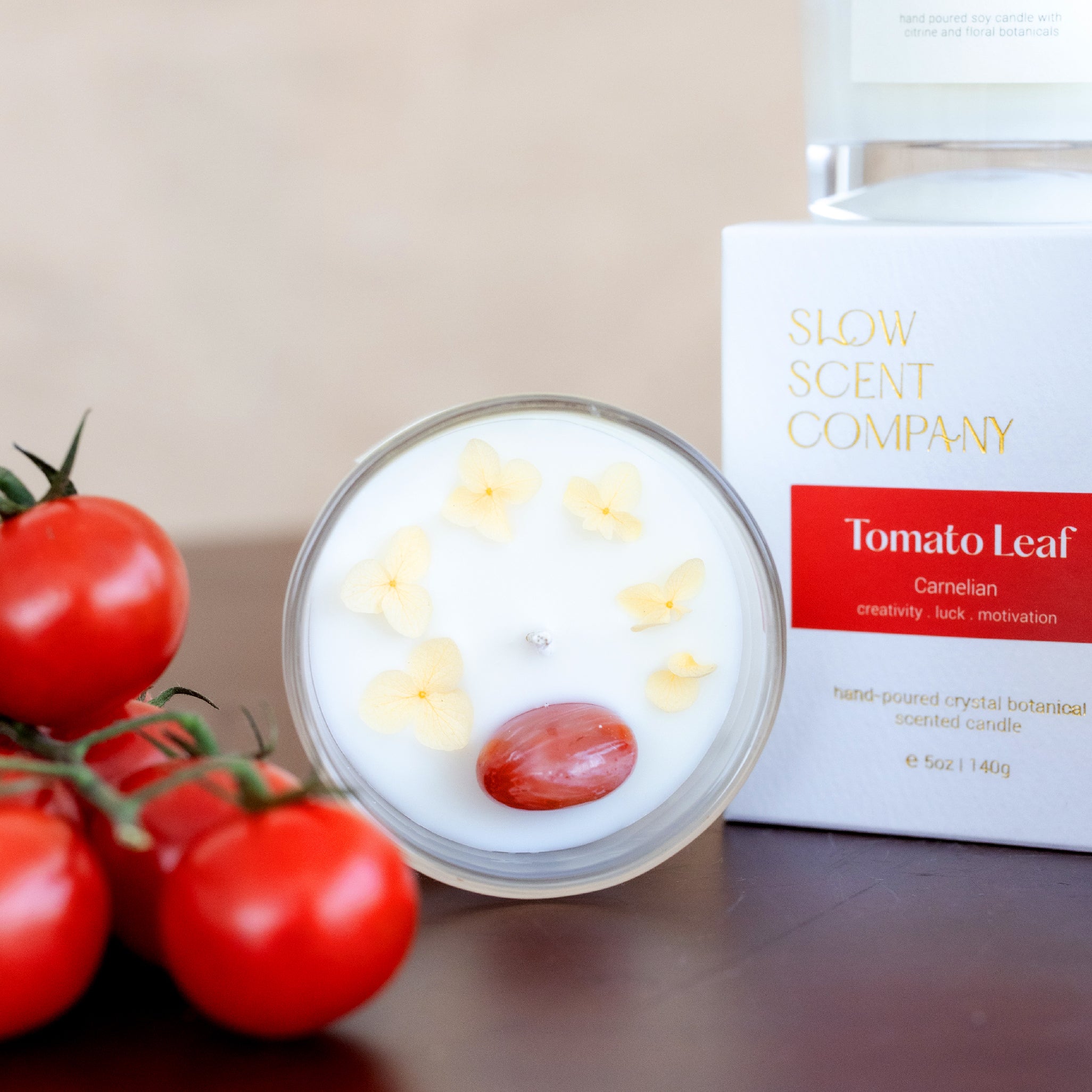 Tomato Leaf is a vibrant and vegetal scent of ripen tomatoes with sun-warmed green tomato vines. Freshly harvested at the farmer's market and blended with herbaceous notes of thyme and basil. A gourmand richness to elevate your space.